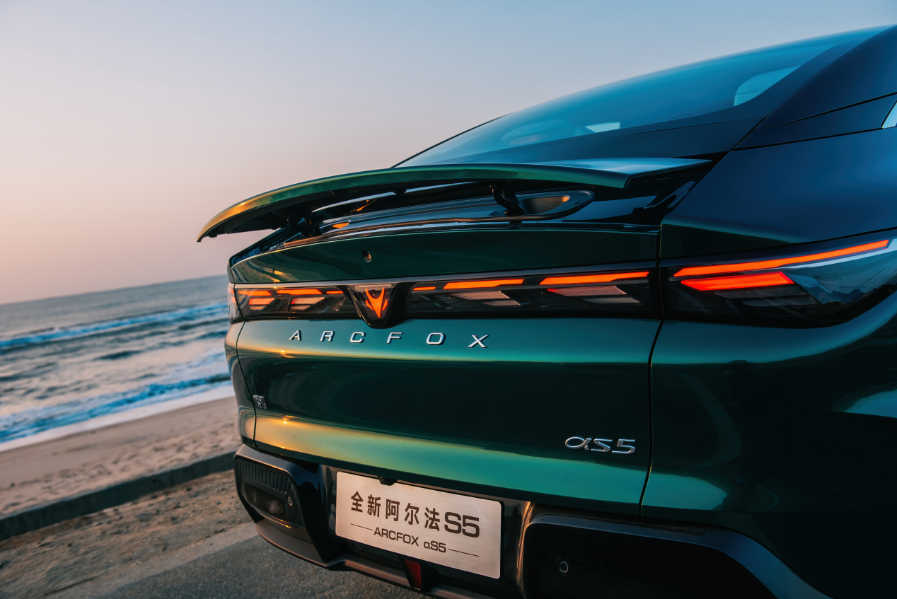 全新阿尔法S5延续极狐“风塑美学2.0”理念,前脸紧致利落,近400颗LED日行灯与360°驾驶辅助小蓝灯构成标志性“蓝眼狐”造型,辨识度极高。车身尺寸较现款增加66mm至4886mm,轴距达2900mm,接近C级车水准,配合大溜背设计、无边框车门、亮色卡钳及3430cm²同级最大智能升降尾翼,营造出纯粹轿跑姿态。0.1925Cd超低风阻系数兼顾美学与效能。