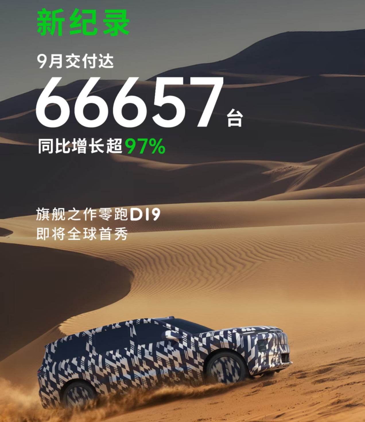 2025年零跑市场表现亮眼:9月交付量达66,657辆,创下新势力单月交付纪录;1-9月累计交付39.6万辆,同比增长128.8%。这一增长势头为零跑冲击高端市场奠定了信心基础。