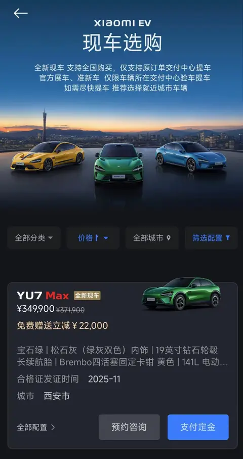 值得一提的是,这也是小米首次向市场投放现车。通过小米汽车APP可见,参与“现车选购”活动的车型集中在YU7和SU7的顶配版本,售价普遍超过30万元,大部分都参加立减22000元的活动。