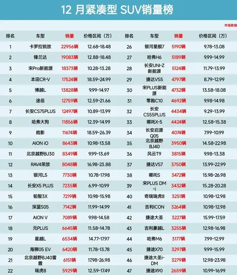 说实话,最近翻完12月紧凑型SUV的销量榜单,心里还真有点小惊讶。卡罗拉锐放一骑绝尘,卖了22956辆,硬是把榜首位置坐得稳稳的;紧跟着锋兰达也不甘示弱,19083辆拿下第二,这俩日系兄弟联手,几乎把前排的风头都抢光了。但你别以为这就稳了——后面那群选手,有的咬牙死撑,有的已经快被挤出圈了。