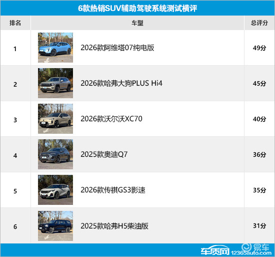 在辅助驾驶车速调节测试对比中,6款车型的整体表现符合预期。虽然调节方式存在差异,但是在调节步骤方面表现一致,调节速度上也仅有沃尔沃XC70稍稍落后。而在调节幅度方面,哈弗大狗PLUS Hi4、2026款传祺GS3影速(以下简称:传祺GS3影速)和阿维塔07纯电版不支持多车速调节,导致出现失分情况。