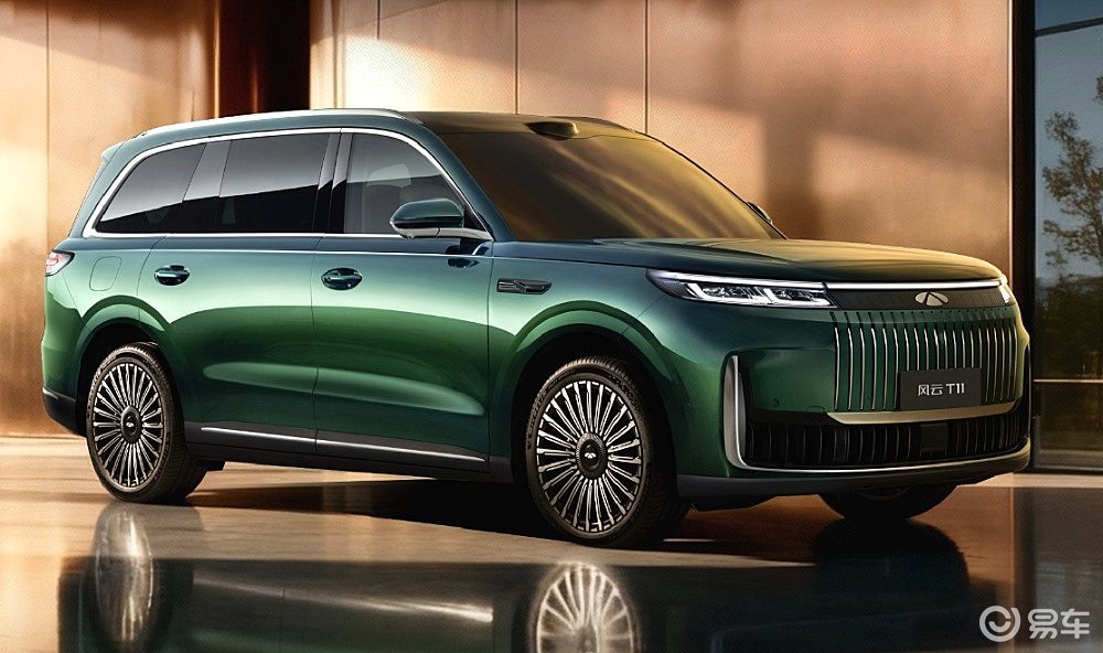 风云T11定位于大型SUV,车身尺寸达到5205×1998×1800毫米,轴距为3120毫米。侧面比例协调,超 5.2 米车长带来修长的车身线条,1800毫米的车高则确保了车内空间的充裕。20英寸的轮圈搭配255/50 R20规格的静音轮胎,既保证了行驶舒适性,也提升了整车的气场。