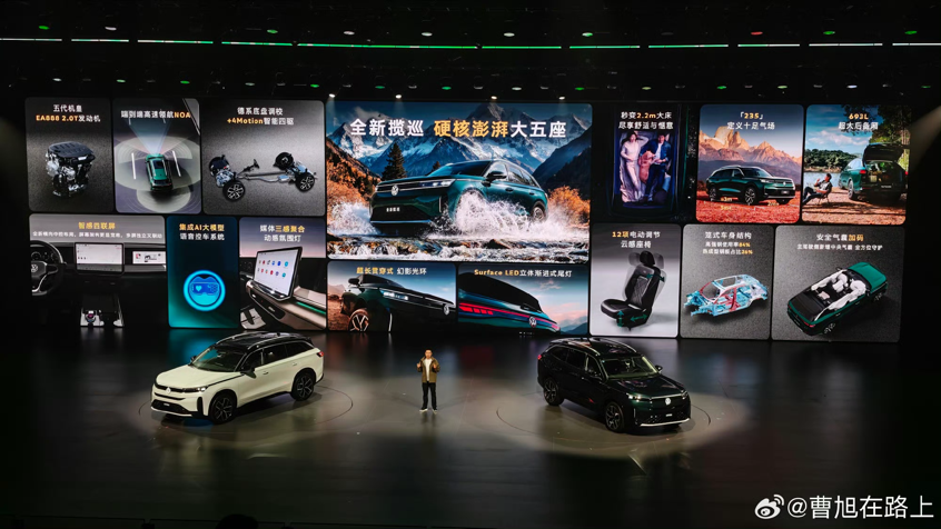 作为本次发布会的核心车型,全新揽巡定位硬核澎湃大五座SUV,专为社会中产群体打造,在延续现款车型舒适、安全、大空间核心优势的基础上,实现造型焕新与动力升级的双重突破。车身尺寸跃升至5007mm×2015mm×1778mm,轴距保持2980mm,69mm的长度提升让宽体大五座布局的优势进一步凸显。在设计上,全新揽巡革新大众家族化语言,环绕式光带搭配纤薄前大灯营造出强烈的科技感与优雅感,R-Line运动化保险杠、银质底盘保护以及哑光与光泽双材质格栅,让硬朗的格调外观更具冲击力,侧面伸展式设计与尾部翼子板线条的融合,更将硬核运动属性拉满。