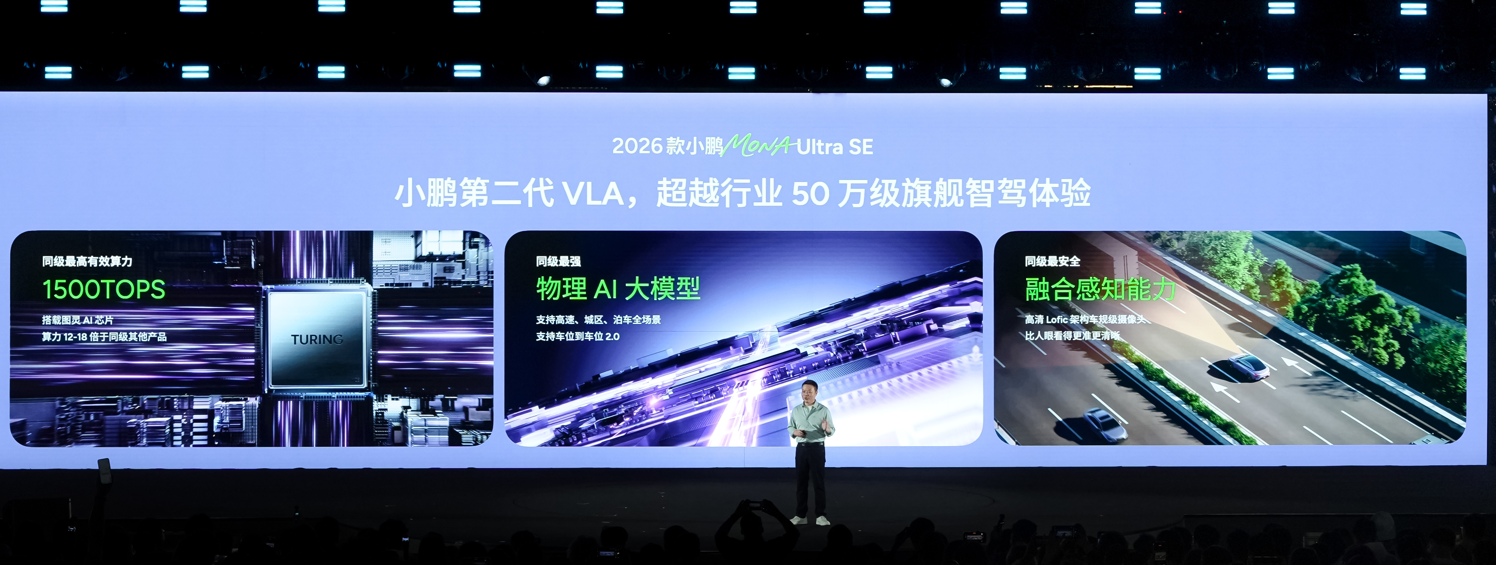 为满足不同用户的智驾需求,新车提供Max版和Ultra SE版双算力版本可选,兼顾高阶性能与实用体验,覆盖全场景出行。其中,Ultra SE版配备双图灵AI芯片,有效算力高达1500TOPS,搭载小鹏第二代VLA,这是一套面向L4时代的物理世界模型,不仅安心丝滑,全场景都能开,而且像老司机一样高效。而Max版搭载单颗图灵AI芯片,有效算力达750TOPS,目前搭载小鹏第一代VLA,2026年第三季度将开启小鹏第二代VLA蒸馏版上车,在驾驶体验、运行帧率、响应时延与稳定性等维度,完整保留小鹏第二代VLA的核心能力。
