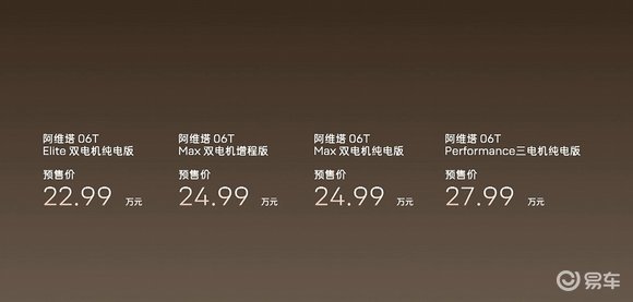 同样在这场发布会中,新款车型阿维塔 06T也同时正式开启预售,该车定位 “智美全场景运动轿车”共推出4款车型版本,预售价22.99万元—27.99万元。现在下订还可享2,000元意向金抵扣 ¥5,000 元大定定金和阿维塔 x 宁德时代联名超薄磁吸充电宝,限量 5,000 份;