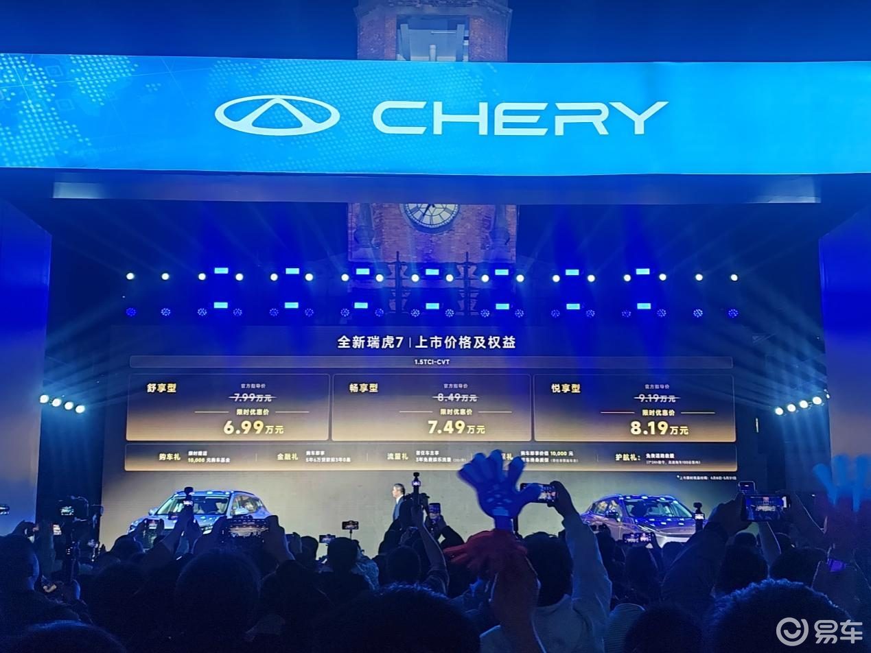 全新瑞虎7共推出三款配置车型,含权益最终优惠后售价分别为舒享型,售价6.99万元、畅享型,售价7.49万元、悦享型,售价8.19万元。