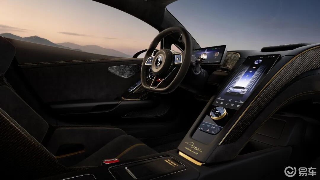 新车车身漆面融入微米级的超细金粉,哑光金部分则使用了非遗的大漆打磨工艺。最吸睛的当属车头的甲骨文黄金车标,这是仰望品牌Logo首次以金色呈现,字体源自商朝甲骨文,既是文化图腾,也是身份标识。22英寸锻造轮毂采用暗金色调,与车标遥相呼应,细节之处尽显中式美学的考究。