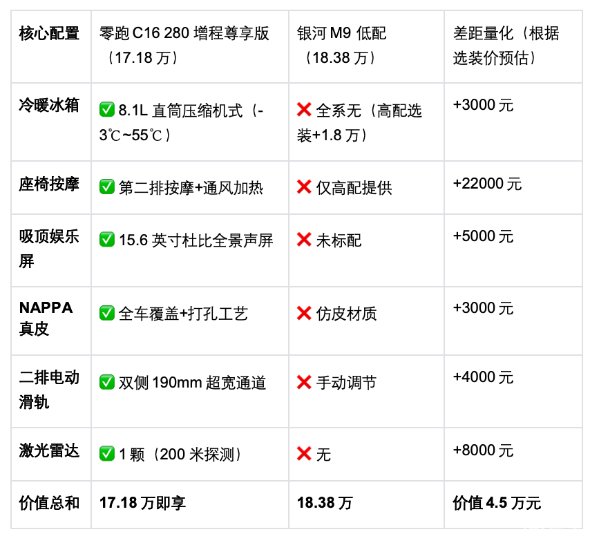 当吉利银河M9以18.38万起的正式售价(限时价17.38万)刷屏热搜时,手握17万购车预算的众多家庭用户以为“高端六座SUV触手可及”——直到点开配置表,才发现这像极了你买房时候买到的“毛坯房”,其冰箱、彩电、按摩等舒适性配置及高阶驾驶辅助在最低配上根本没有。
