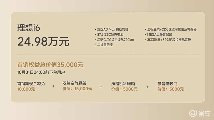 即日起,理想i6可以通过理想汽车官网或理想汽车App进行订购。2025年10月31日24:00前确认订购的理想i6用户,将享受10,000元的现金减免权益,以及双腔魔毯空气悬架、智能冷暖双用冰箱、全车静音电吸门的免费赠送权益,限时首销权益可与其他权益叠加使用。