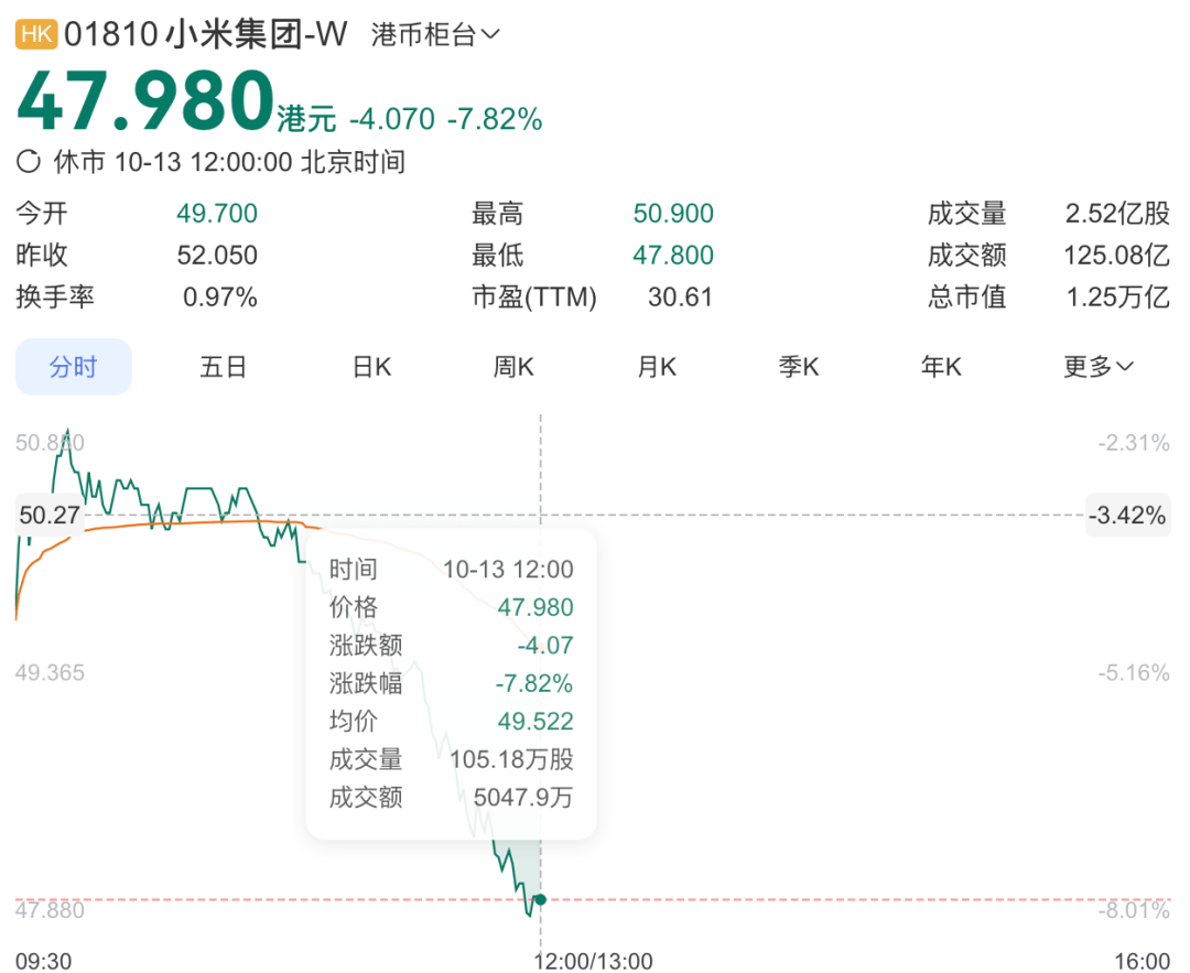 小米SU7的安全问题正被反复置于聚光灯下。官方的沉默,与资本市场的反应形成了鲜明对比。截至10月13日午盘,小米集团(01810.HK)股价跌7.82%,报47.98港元/股。