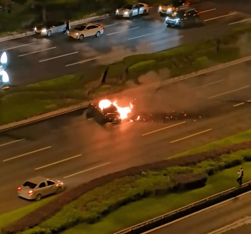 网络流传的行车记录仪画面及现场信息显示,事发时天府大道路面车流较少,涉事车辆以较快速度超越前方一辆时速为104km/h的视频车后不久,即发生事故并燃起明火。