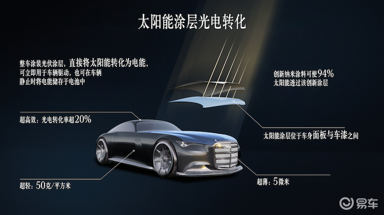 车身表面的太阳能涂层技术是Vision Iconic概念车的一大亮点。 这种创新材料可以像极薄膏体般无缝涂覆于电动车车身,光伏活性表面可适配各种基底。 太阳能涂层的光电转化效率高达20%,即使车辆处于熄火状态也能持续发电。