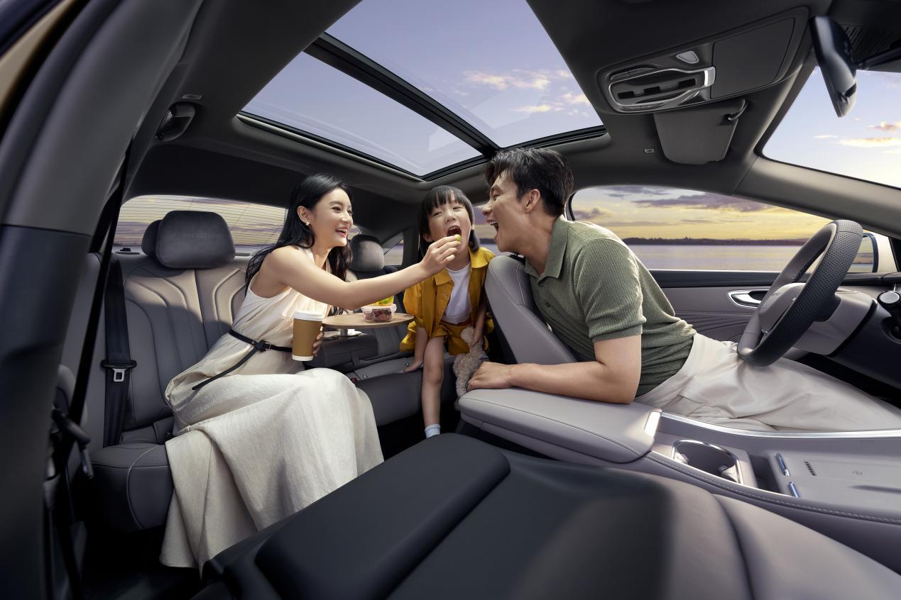 在这里还要着重说一下它的全景沙发躺椅,是同级中唯一采用水平折叠模式设计的,而且也支持语音、椅背按键、门板按键操控等便捷操作,副驾翻折后能够形成后排专属的超长腿托。一句话,就是你在后排也能体验到和前排一样的宽阔视野,带来的好处是家人互动更方便、长辈坐着不累也不闷,自己还能随时小憩,可以说是满足全家人需求的全能家轿了。