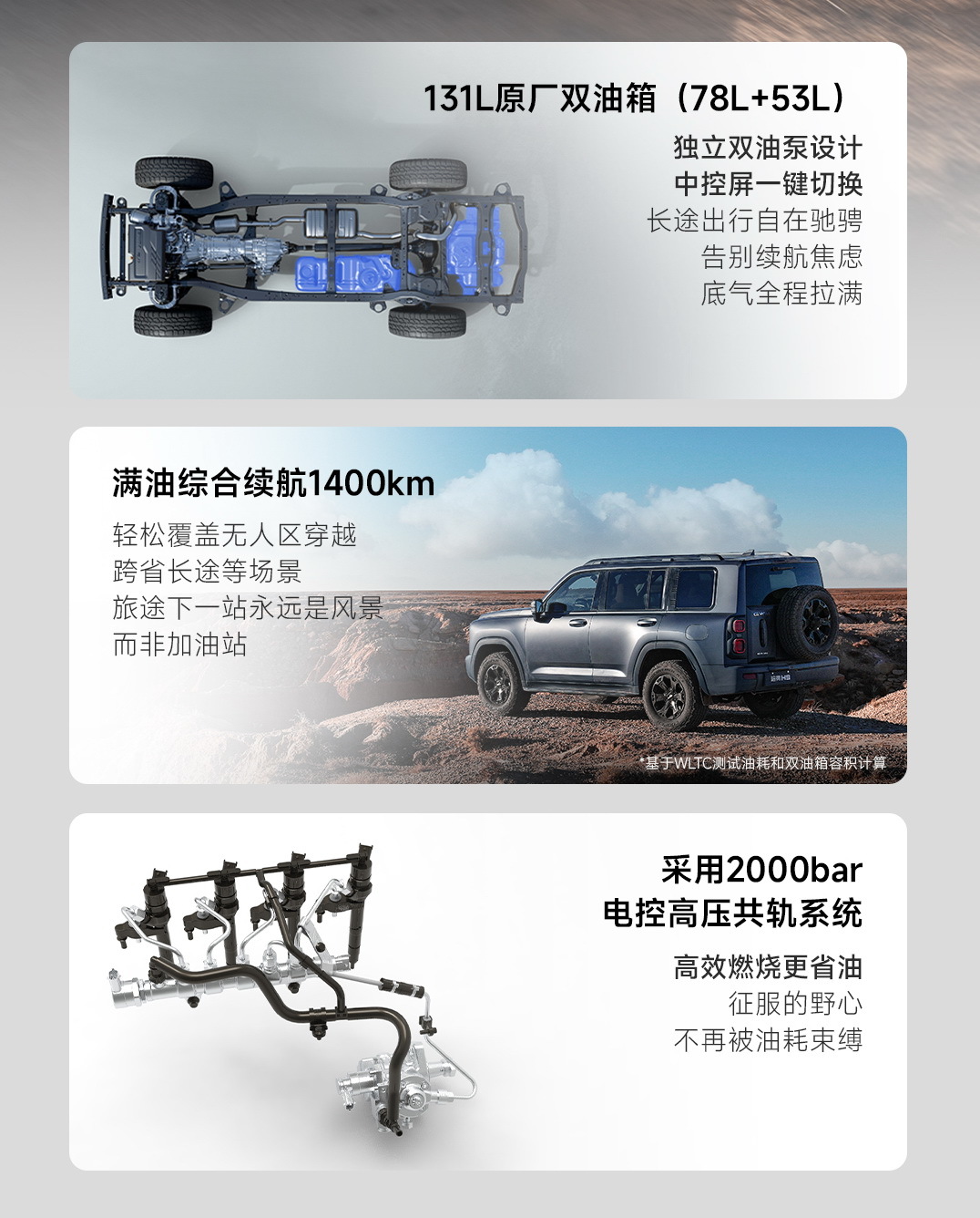 值得一提的事,双油箱设计不再是豪华品牌在中东等地区的“海外版本特供”,如今H9穿越版让其成为国内消费者的原厂标配,131L双油箱配合高效动力总成,能够实现“1400公里无补给”,让你有能力直达远方。