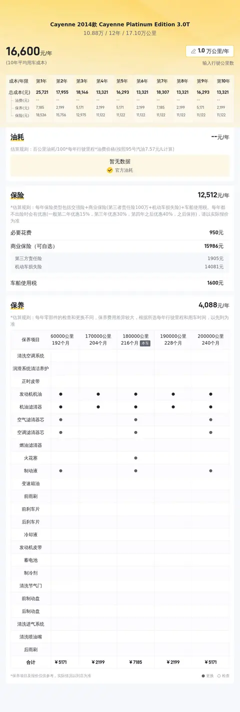接着,来看看这辆车的用车成本。据估算,这辆车的燃油费用约1.1万元/年,保养费用大约4604元/年,保险费用参考值为13781元/年,其他费用根据个人情况而定。总体来看,预计年度用车成本在2.6万元左右。