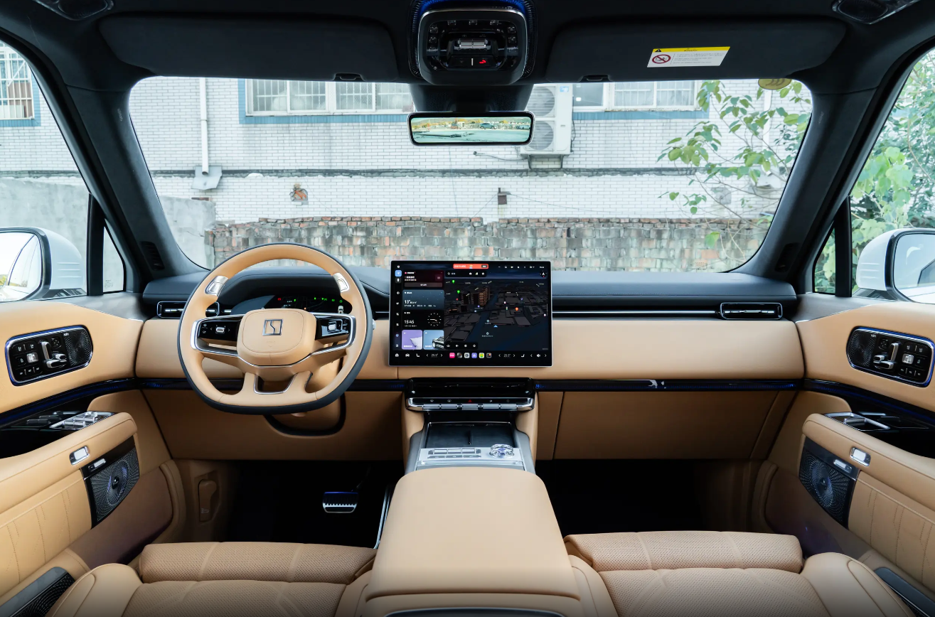 在座舱设计上,外观的差异在智能与豪华的融合方式上得到了延续。问界M9的座舱采用了翼展式的T型结构,并且采用了木纹饰板和软性皮质包覆,整体呈现出相对居家的内饰氛围。其核心竞争力在于座舱内整合了华为鸿蒙生态,座舱内三联屏与75英寸AR-HUD的联动,构成了较为全面的信息显示矩阵,车机内还可实现“可见即可说”的六音区语音交互,并能通过桌面功能直接运行手机应用。在辅助驾驶功能上,整车搭载了华为ADS系统,并配备了包括4颗激光雷达在内的36个感知硬件,能实现“车位到车位”的全场景驾驶辅助能力。