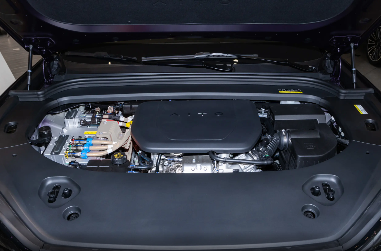 问界M9采用了1.5T增程式动力,1.5T增程器有着118kW的功率,前后双电机的组合有着365kW(496Ps)的功率和675N•m的扭矩,百公里加速为5.1秒。整车配有一块52kWh的电池组,CLTC工况下可提供266km的纯电续航,而配合65L的油箱,CLTC综合续航里程可达1417km。这意味着用户在日常通勤中可完全用电,而长途出行时又能像燃油车一样没有太多续航焦虑。