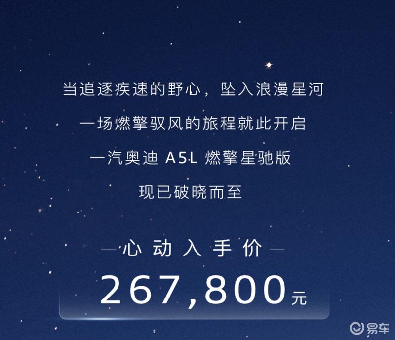 易车讯 1月30日,一汽奥迪宣布A5L燃擎星驰版正式上市,售价 28.58 万元,心动入手价26.78万元。新车主要在配置上进行了调整升级,定位介于在售的运动版 Plus和乾崑智驾版之间,带给消费者更多选择空间。
