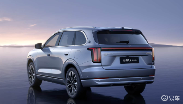 车身侧面,山海L7 PLUS给人以四平八稳的坚实感,窗线镀铬饰条提升了精致度。其采用的半隐藏式门把手,在优化风阻的同时也兼顾了侧面线条的流畅美感。车门下方的内凹型面与235/55 R19的轮胎搭配,进一步强化了立体感。其车尾设计厚实饱满,熏黑处理的贯穿式尾灯向下延伸,辨识度较高,隐藏式排气布局则彰显了其新能源身份。此外,其车身三围为4810×1930×1705mm,轴距2820mm。