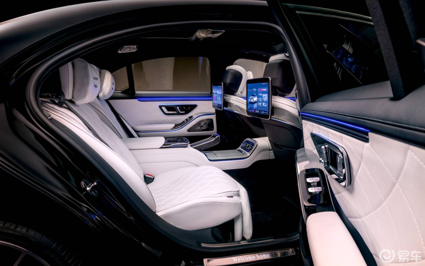 再来看看后排,新款奔驰S级(长轴距版本)将会提供四座布局,后排配备“头等舱座椅”,支持最大43.5度的靠背调节与50度的腿托角度。在中央扶手区域集成无线充电面板、隐藏式储物空间、独立冷藏箱及可控温杯架等等。另外,后排还会配备带高清摄像头的13.1英寸显示屏和两个可拆卸MBUX遥控器,音响方面则会提供Burmester 3D环绕立体声音响系统或支持杜比全景声的Burmester高端4D环绕立体声音响系统(39个扬声器)。
