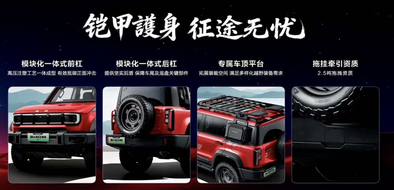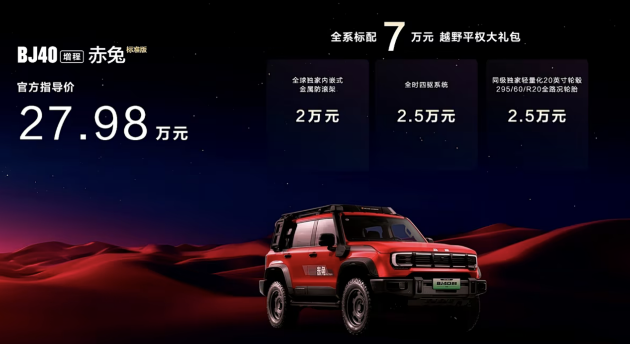 追求更强越野性能的朋友也可以选择BJ40增程赤兔版,新车指导价27.98万元,原厂标配车内金属防滚架,全时四驱系统以及全路况轮胎。此外,消费者购买该车型,还可享受三电终身质保、5年10万0息贷款、最高10000元置换补贴、5年5次免费基础保养、三电系统自燃烧1赔1等权益。
