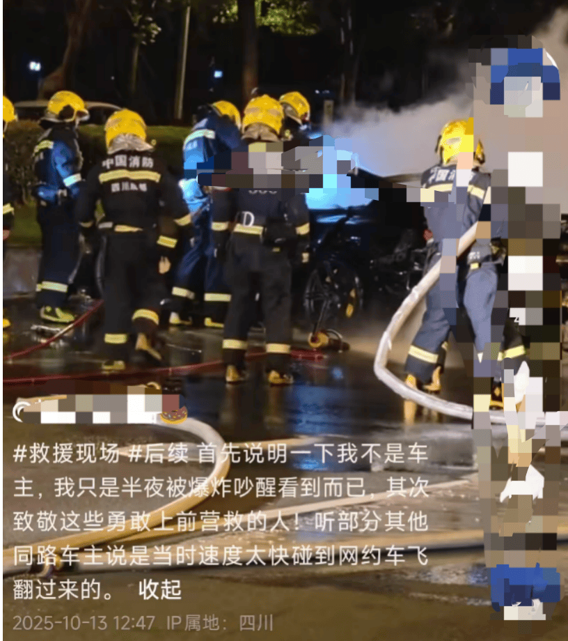 10月13日凌晨,四川成都天府大道,一辆疑似小米SU7 Ultra的车辆发生碰撞后,瞬间燃起熊熊大火。